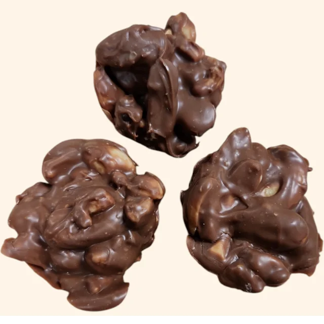 Nut Clusters – (includes almonds, cashews, hazelnuts, brazil nuts, pecans, and peanuts) dipped in creamy milk chocolate.